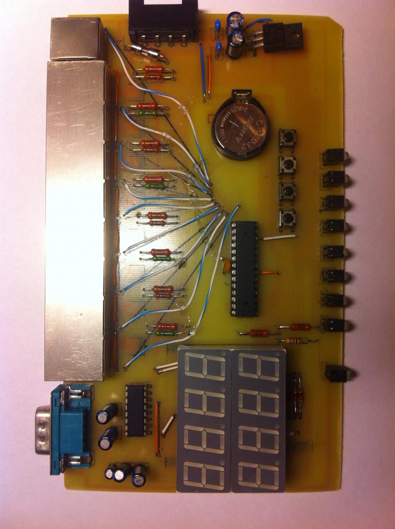ATmega8, max232, модем Siemens внешний. Установка температуры раздельно на 8 каналов. по входящему звонку отправляется SMS с установленной и фактической температурой по каждому каналу.